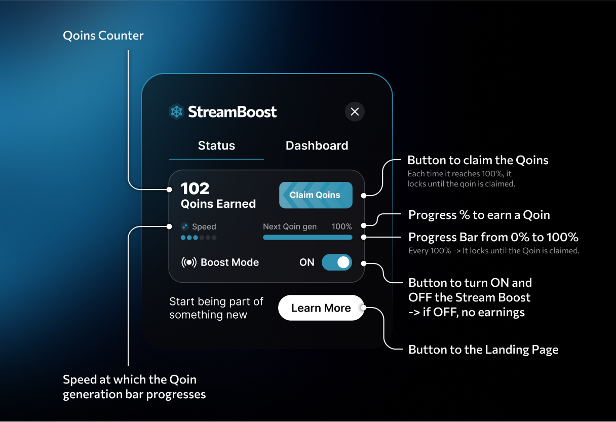 The Status tab shows how many Qoins you’ve earned, how fast you’re generating them, and how close you are to your next reward.